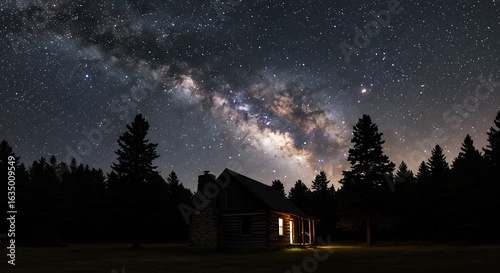 星空輝く山小屋、静かに夜を彩る温かな光. AI Generated