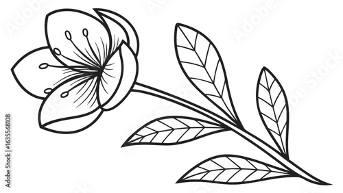 Elegant Black and White Line Art Flower Illustration. Botanical Floral Sketch with Stem and Leaves for Coloring or Design.