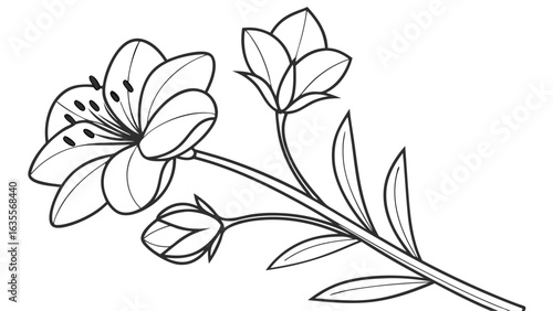 Elegant Line Art of a Blooming Flower with Buds and Leaves, Ideal for Coloring Books and Botanical Illustrations