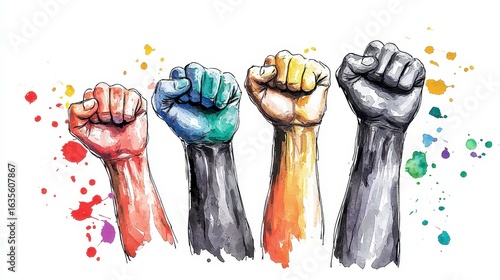 A powerful watercolor illustration depicts five fists raised high in solidarity, symbolizing unity, strength, and collective action against injustice and promoting social change