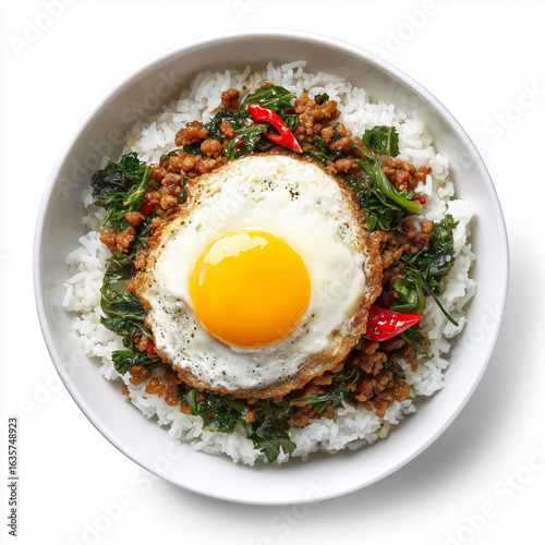 Thai pad kra pao with crispy fried egg and rice