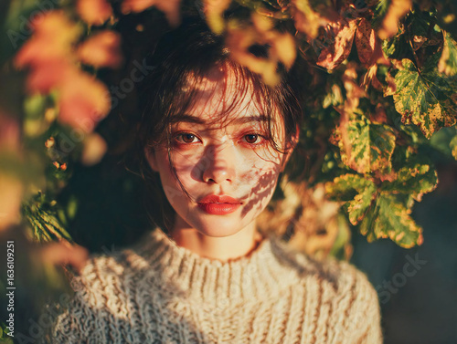 Beautiful Asian woman in cozy knitwear under autumn leaves, softly illuminated by natural light, with a calm and elegant expression in a warm seasonal atmosphere