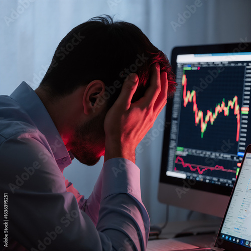 Zestresowany inwestor patrzący na spadający wykres giełdowy na monitorze