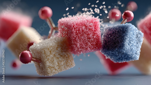 Floating sugar cubes dissolving into vibrant molecular structures, depicting metabolic balance.