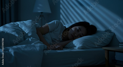 Sleeplessness: Stressed young woman struggling to fall asleep at night