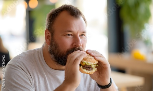 A real photo of a chubby man in his 30s eating a hamburger