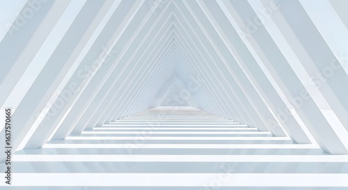 A bright, futuristic corridor of repeating white triangular frames creating a vanishing point perspective.