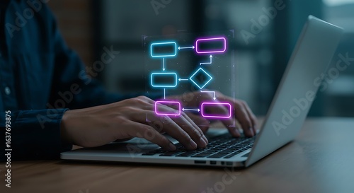 Person typing on laptop with glowing digital flowchart diagram, representing data analysis, process automation, and workflow optimization in technology