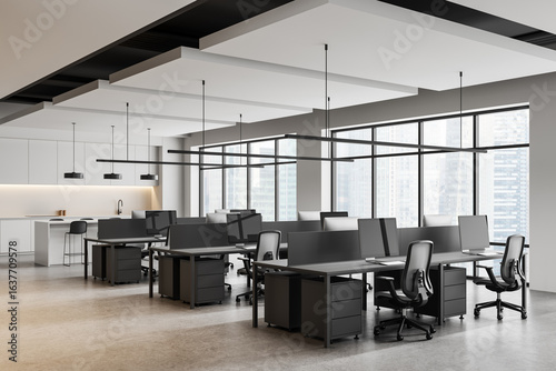 Modern open space office interior with workstations and ergonomic chairs in a high-rise building, clean minimalist design and bright atmosphere concept. 3D Rendering