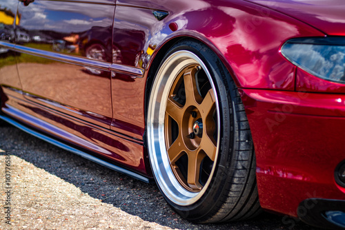 Close-up of a modified red car featuring bronze aftermarket wheels and low-profile tires, reflecting surroundings in its polished body.