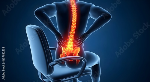 Glowing Spine with Lower Back Pain in Blue, Seated Figure