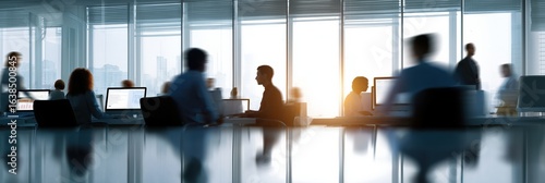 Busy office environment with diverse professionals working at desks