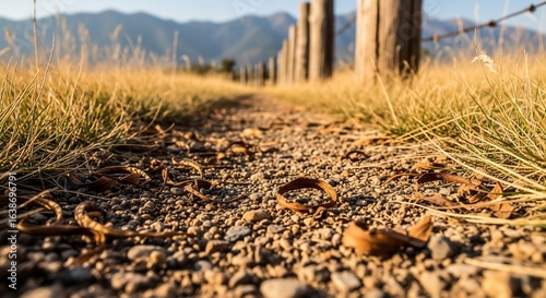 Low angle view of a gravel path lined with wooden posts and dry grass