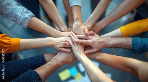 Multiple hands stacked together symbolizing unity, teamwork, and collaboration in a diverse group with casual clothing indoors