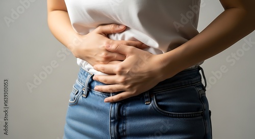 Woman with hands on her stomach suffering from severe abdominal pain, menstrual cramps, period ache, or indigestion.