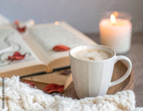 Mug kopi latte putih berbusa dalam suasana musim gugur yang nyaman dengan buku terbuka, daun kering, lilin menyala, dan selimut rajutan. Latar belakang lembut, nada hangat, komposisi damai.