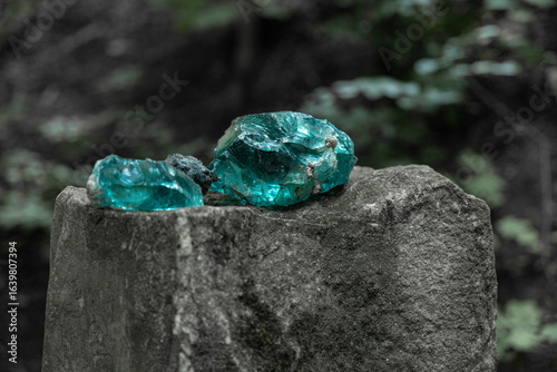 Przezroczyste, błękitne kawałki szkła na betonowym cokole