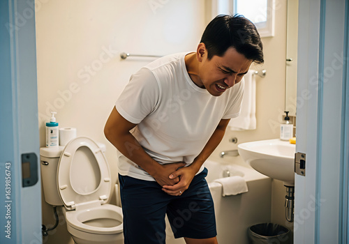 Man in bathroom with abdominal pain. An upset portrait of health issues and discomfort. Digestive problem, urgent need, urinary tract infection.