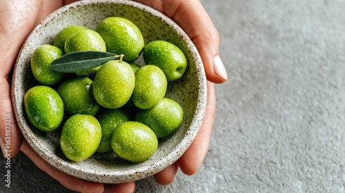 Hands of a Turkish olive grower presenting Edremit olives in a white stone dish