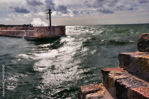 Ustka - Widok wzburzonych fal morskich uderzających o solidny betonowy pomost, z burzliwym niebem nad głową. Ten dramatyczny krajobraz ukazuje potęgę natury i potęgę oceanu uderzającego o brzeg.