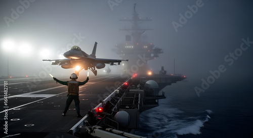 F-16 fighter jet landing on an aircraft carrier at midnight fog with deck crew guiding.