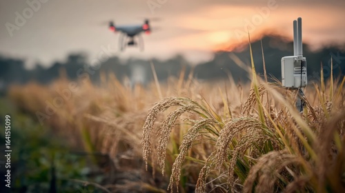 稲穂の上を飛ぶドローンと美しい夕焼けの農場風景