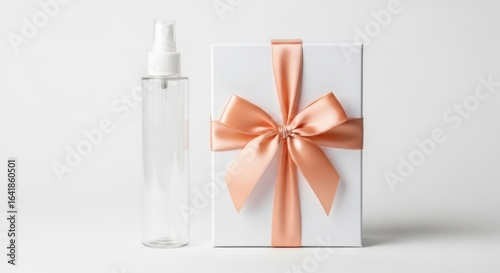 Clear spray bottle and peach ribbon gift card isolated on white background
