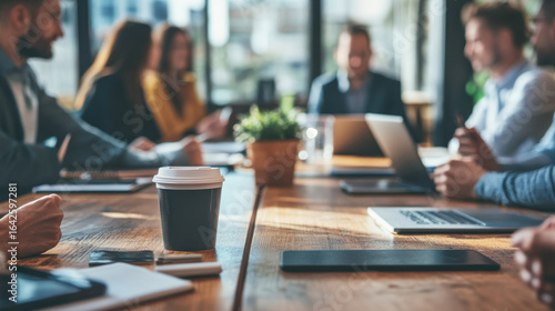 Collaborative Meeting in Modern Office with Focus on Coffee Cup