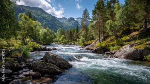 A clear river runs rapidly through vibrant green vegetation and rocky formations, surrounded by majestic mountains under a bright blue sky. The sun illuminates the scene, adding warmth.
