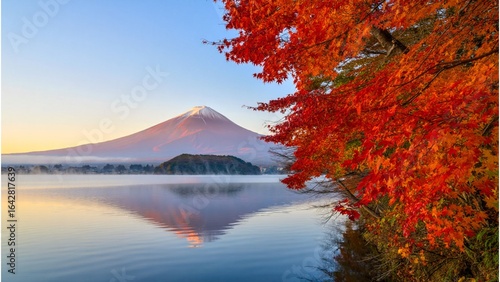 Colorful Autumn at Lake Kawaguchiko with Mount Fuji and Morning Fog