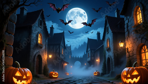 中世ヨーロッパ風の石造りの街並み、夜空に浮かぶ大きな満月とコウモリ、路地には輝くジャック・オー・ランタン、霧が漂う幻想的な雰囲気、暖色と冷色の光のコントラスト、縦構図、ポスター用余白あり、文字やロゴのない純粋なイラスト