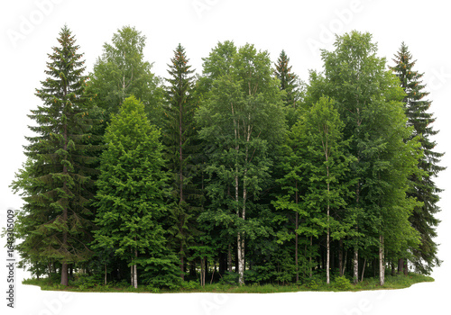 A dense forest of various green trees, including deciduous and coniferous species, isolated on a transparent background