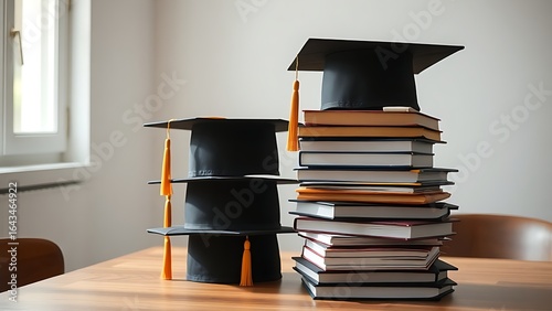Stacked graduation hats on a wooden table, softly lit by natural window light in an academic setting.