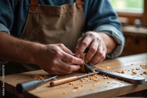 Luthier artisan sculptant et assemblant un violon dans un atelier traditionnel en bois éclairé par la lumière naturelle d’une fenêtre