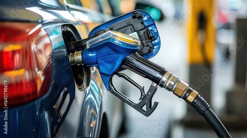 A car with a blue fuel nozzle attached to it, filling up with fuel at a gas station.