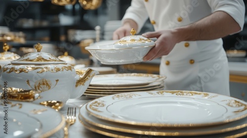 Chef sets elegantly designed dinnerware in upscale restaurant kitchen during busy service