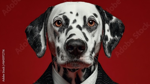 A fashionable Dalmatian dog dressed in a stylish suit and sunglasses poses elegantly against a vibrant red background showcasing a charming blend of style and canine charisma