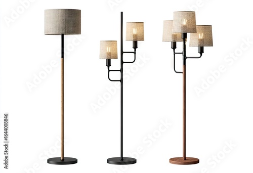 Three floor lamps with varying designs; one single-shade, one three-shade branched, and one three-shade clustered. All feature simple, neutral fabric shades and dark metal bases