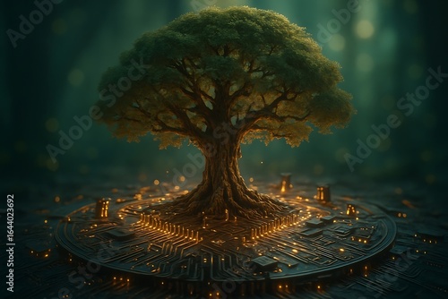 Majestic ancient tree illuminates mystical forest floor with golden light