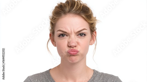capricious woman with pouting lips in studio portrait of confused girl face annoyed woman face expression female model grimace on white background no logos no brands ar 169