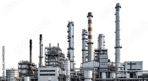 Industrial refinery complex with tall smokestacks and intricate pipe systems isolated on a transparent background