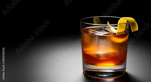 Godfather cocktail with lemon twist garnish black gradient background. Mixology, bar menu, colorful vibrant refreshing drink in old fashioned glas