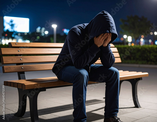 Mężczyzna w kapturze siedzący na ławce – depresja