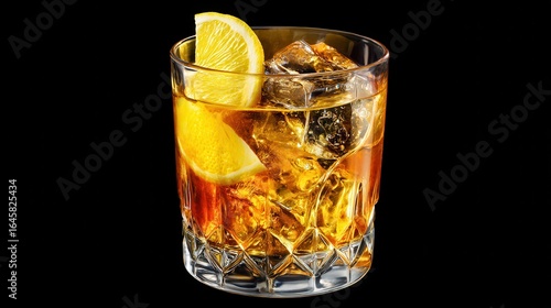Godfather cocktail with lemon twist garnish transparent PNG isolated background. Mixology, bar menu, colorful vibrant refreshing drink in old fashioned glass