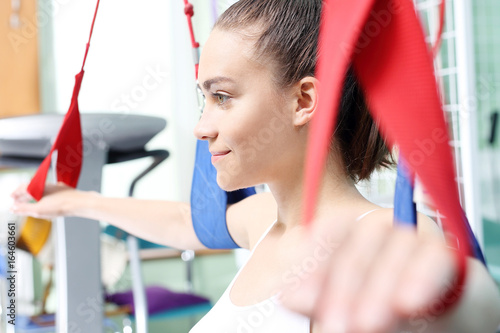 Rehabilitacja kończyn górnych. Kobieta ćwiczy ręce na podwieszkach odciążających.