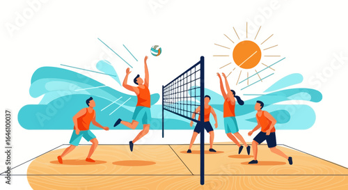 Dynamic Beach Volleyball Match with Vibrant Sun and Ocean Waves Illustration