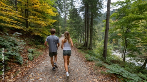 Couple Running on Forest Trail Autumn Colors.