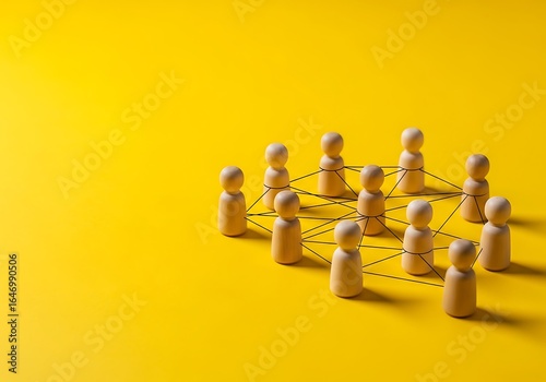 Wooden figures connected by lines on a yellow background, symbolizing teamwork, collaboration, and communication within a group or organization, representing interpersonal relationships and unity.