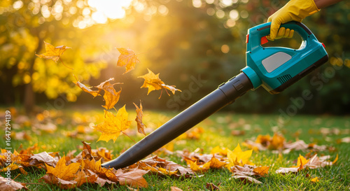 An automatic machine for harvesting fallen leaves with the help of air in the hands of a farmer on the background of a garden. The concept of harvesting fallen leaves during the seasonal period