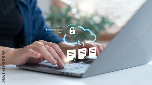 User working on a laptop with a secure cloud storage system, uploading and backing up digital documents, concept of data protection, online file management, and privacy.
